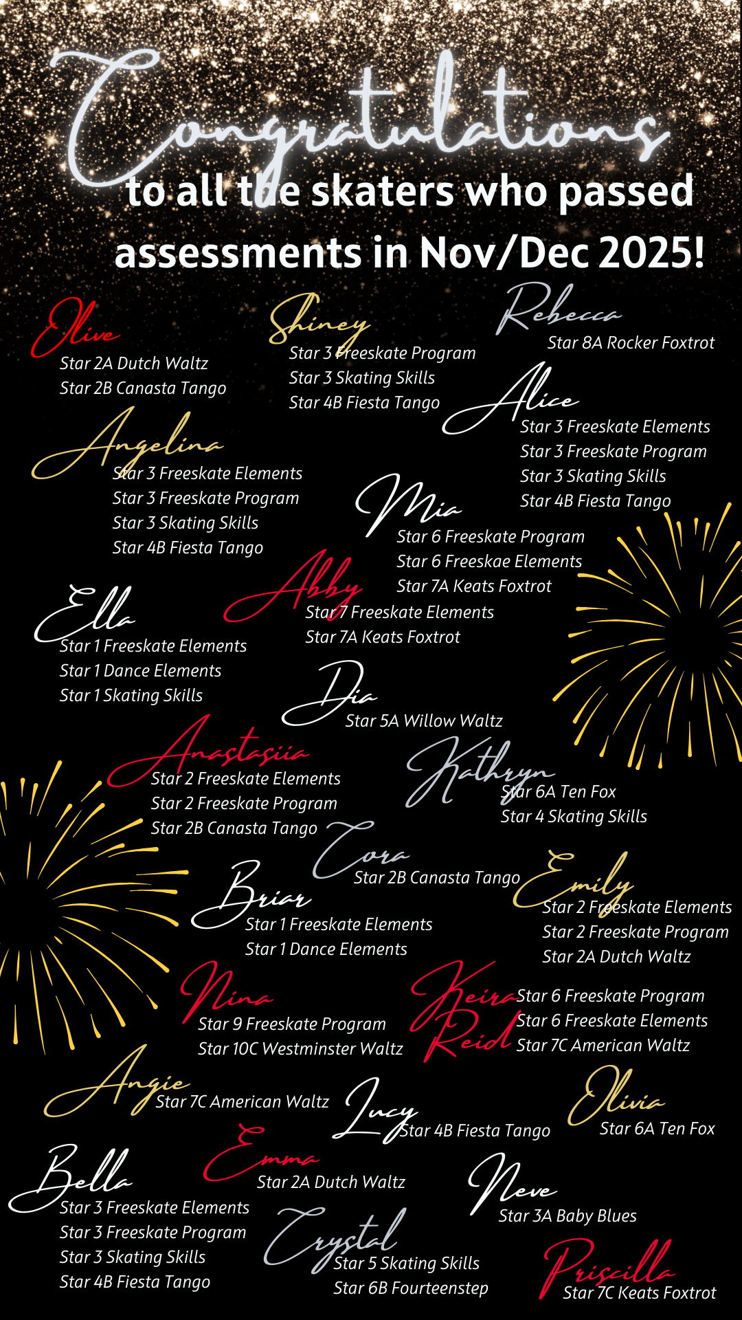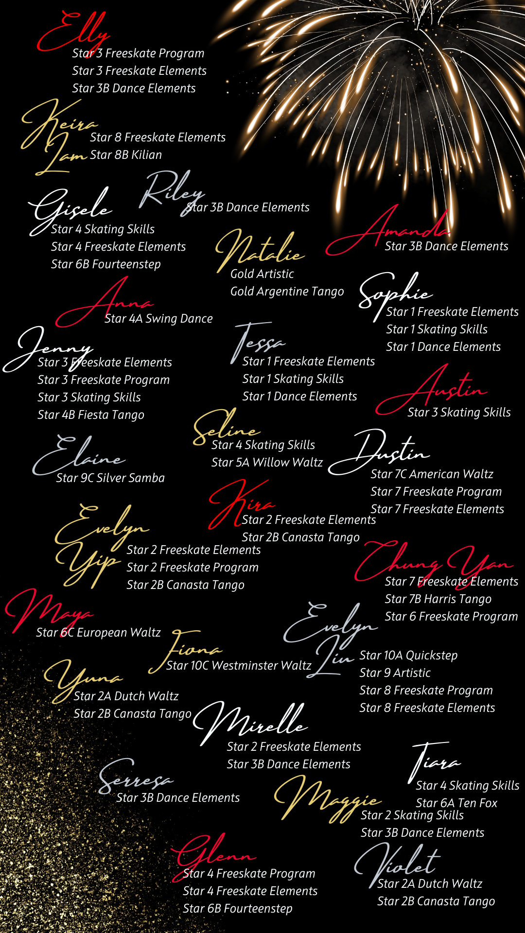 Skaters who complete all the Star levels from 1-Gold are considered "Gold Level" in their respective disciplines. This is a huge accomplishment that takes many years to complete. Congratulations to all those who have achieved this special status!